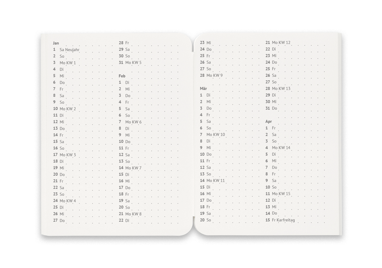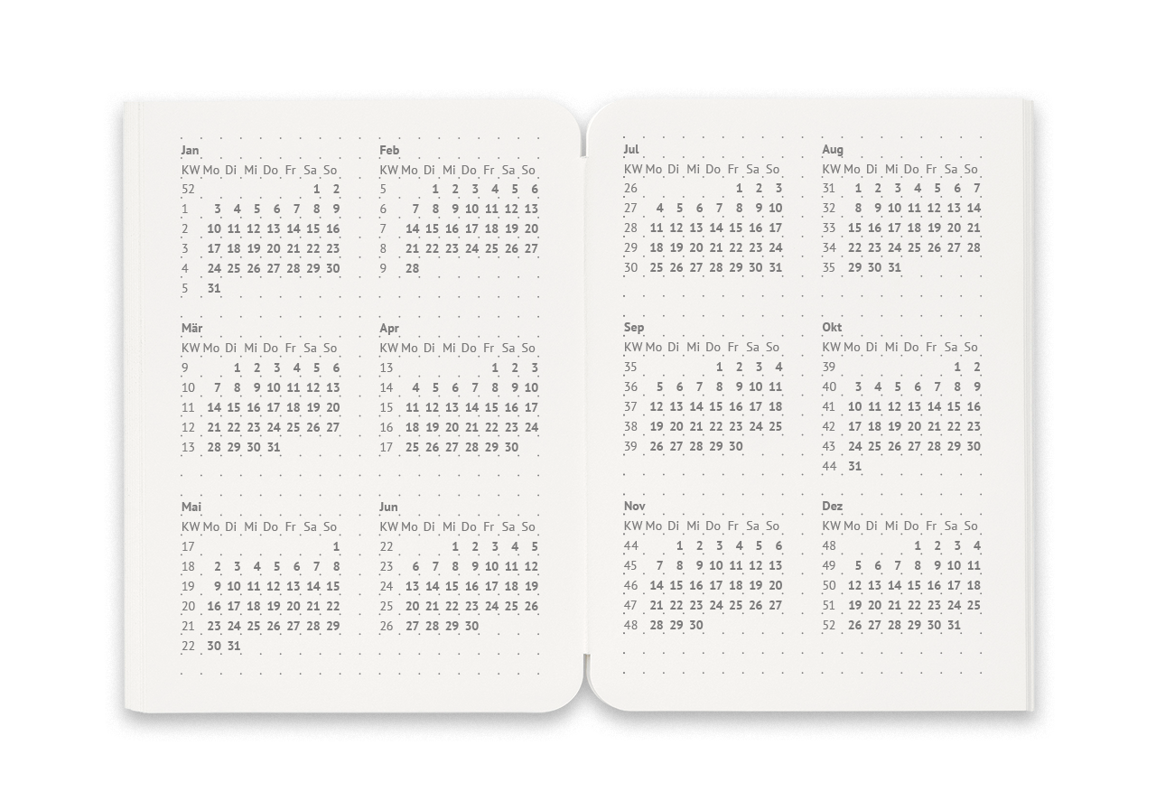 | Innenteil: | Kalendarium, blanko, punktiert |