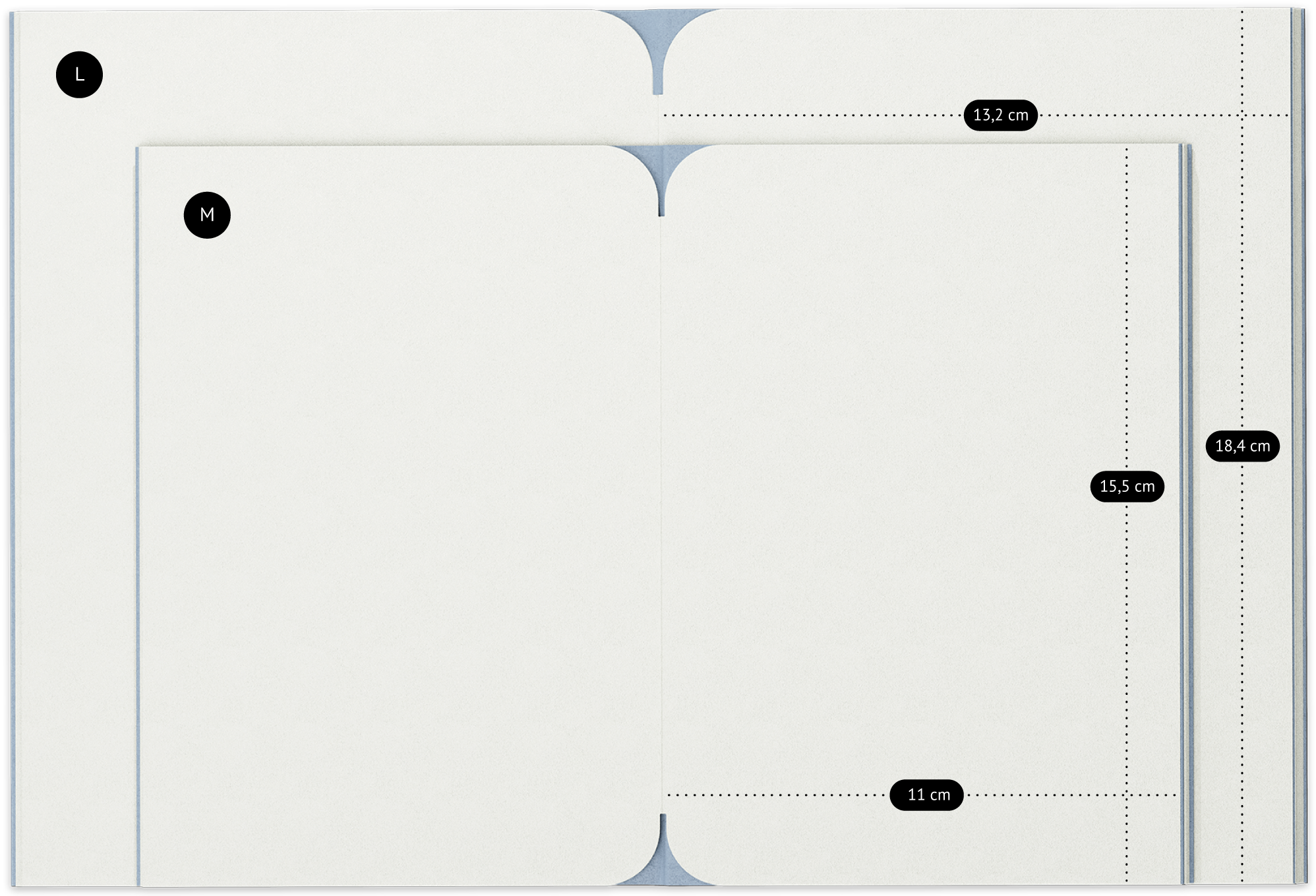Du hast die Wahl zwischen zwei Formaten. Die Größe M ist klein und handlich und passt gut in die Jackentasche. Mit 11,0 × 15,5 cm hat unser Pocketkalender in etwa das Postkartenformat Din A6 und ist der ideale Begleiter für unterwegs. Die Größe L hat mit 13,5 × 18,4 cm noch kompakte Abmessungen und ist kleiner als Din A5. Flach, leicht und flexibel ohne starren Buchdeckel passt es gut in die Seitenfächer von Laptoptaschen und Rucksäcken und ist ebenfalls gut geeignet für den mobilen Einsatz.