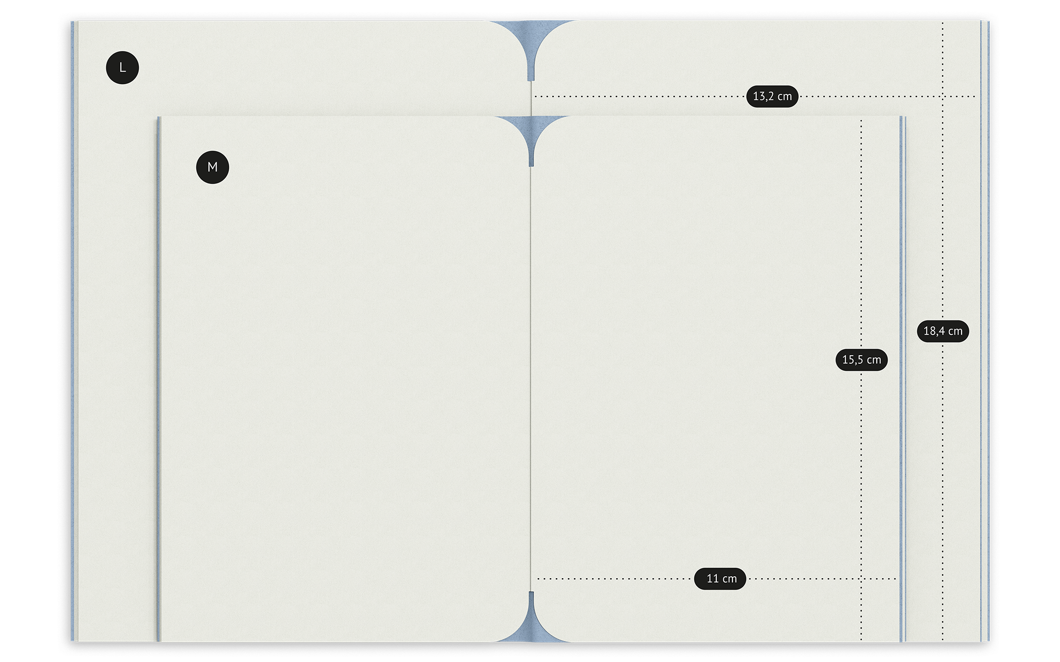 Du hast die Wahl zwischen zwei Größen. Das Format M ist klein und handlich und passt gut in die Jackentasche. Die Größe entspricht dem Postkartenformat Din A6 und ist der ideale Begleiter für unterwegs. Das Format L hat ebenfalls kompakte Abmessungen und ist etwas kleiner als Din A5. Das Format eignet sich gut als Bulletjournal, zum Schreiben von kurzen Texten sowie für kreatives Arbeiten mit kleinen Skizzen und Zeichnungen.